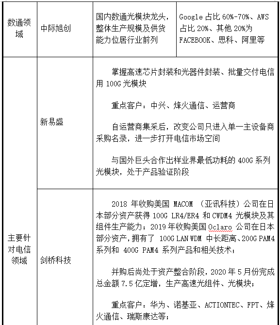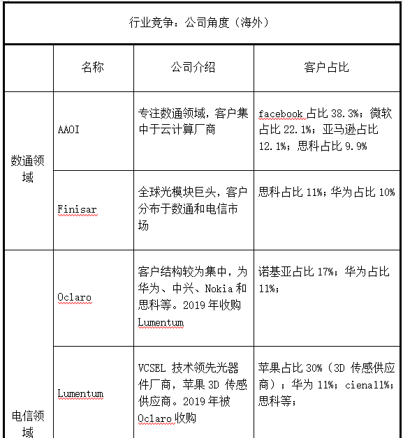 從細(xì)分領(lǐng)域數(shù)通市場看,根據(jù)2019年全球光模塊市場銷售情況及對(duì)光模塊公司下游客戶的分析,目前國內(nèi)外數(shù)通領(lǐng)域(應(yīng)用于IDC)具備高速光模塊供貨能力企業(yè)有中際旭創(chuàng)(300308)、海外AAOI(應(yīng)用光電)和Finisar(菲尼薩)。