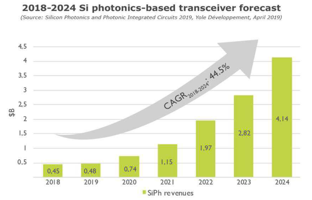 從市場規(guī)模上看,硅光模塊市場規(guī)模增長較快。據(jù)Yole預(yù)測,硅光模塊在2018年-2024年間的復(fù)合年增長率將達(dá)到44.5%,有望從2018年的4.55億美元增長到2024年的40億美元,2024年占整體市場規(guī)模21%。