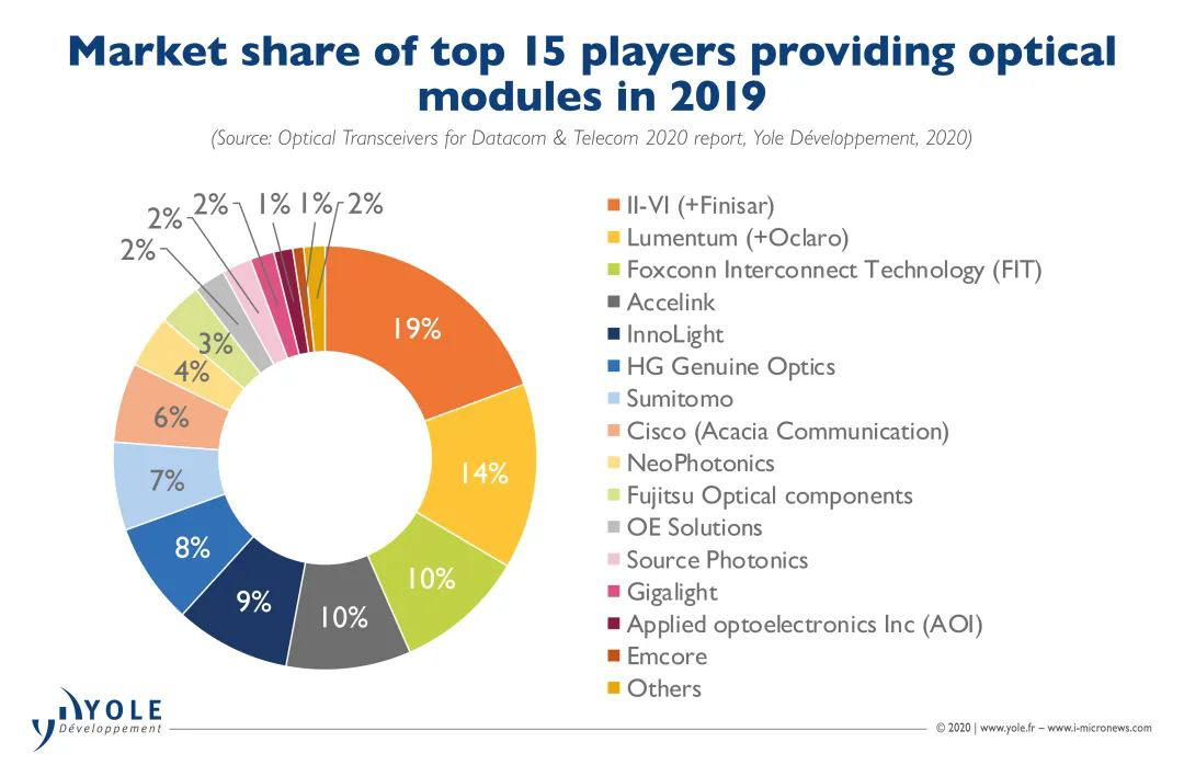 從細(xì)分領(lǐng)域電信市場看,海外廠商主要有Finisar、Lumentum、II-VI、Acacia、Oclaro等國際知名企業(yè),其占據(jù)高端光模塊市場;國內(nèi)廠商聚焦在無線接入、FTTH及城域100G以下速率產(chǎn)品;如光迅科技、新易盛、華工正源等。