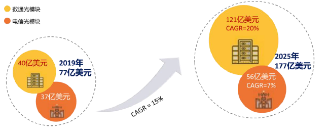根據(jù)Yole最新報(bào)告,光模塊市場規(guī)模2019年達(dá)到近77 億美元,依托5G與數(shù)據(jù)中心“新基建”雙重驅(qū)動(dòng),2025年市場規(guī)模預(yù)計(jì)177億美元。