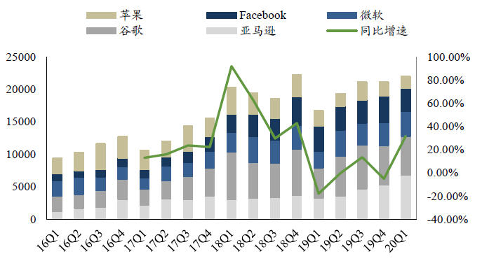 伴隨5G時(shí)代流量需求爆發(fā)增長,帶動(dòng)全球IDC高速發(fā)展。為滿足大帶寬需求,新一代數(shù)據(jù)中心網(wǎng)絡(luò)架構(gòu)表現(xiàn)為更多的橫向流量,帶來更多的互連需求。云計(jì)算巨頭(亞馬遜、谷歌、Facebook、微軟)資本開支已于2019Q2逐步回暖,隨著資本開支回暖和數(shù)據(jù)中心的代際更迭,云基礎(chǔ)設(shè)施建設(shè)將有望迎來上升期,打開數(shù)通光模塊需求空間。國內(nèi)方面,隨著國內(nèi)企業(yè)上云的加速、5G商用后移動(dòng)數(shù)據(jù)流量的提升,推動(dòng)國內(nèi)云計(jì)算巨頭提升資本開支以提高其處理數(shù)據(jù)能力。